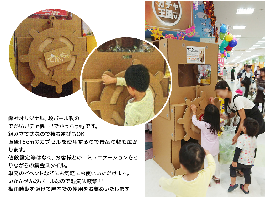 弊社では、店舗に合わせた機械のカラーリングを行っています。基本は白の機械を、赤に塗ったり、ときには木目調にデザインしたりして、目で見て楽しい売り場づくりを展開しています。また、さまざまなイベントで活躍できる弊社オリジナル段ボールガチャ機「でかっちゃ®」も製作しております。